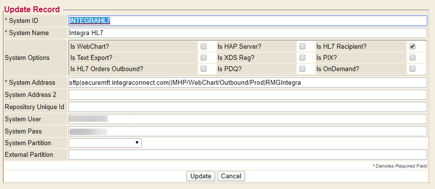 * System Address - This is the end point information. This can be a URL, Filename, SFTP, among others.