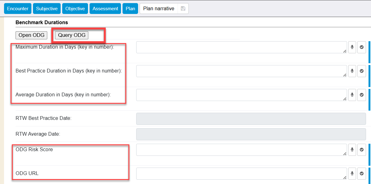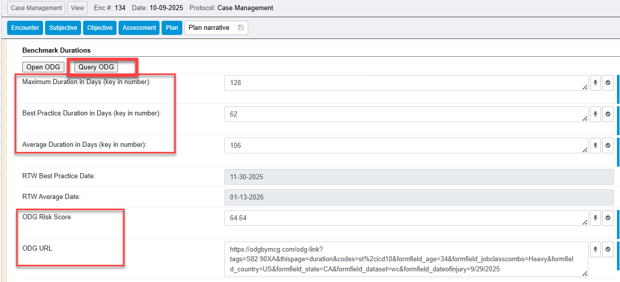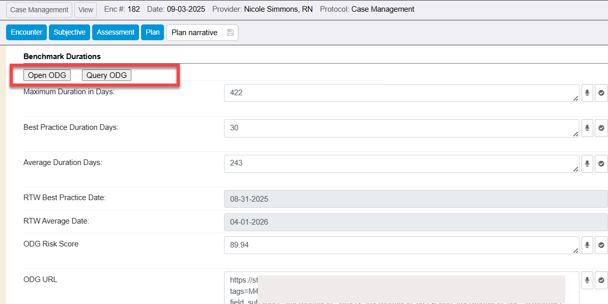 * ODG URL: Inserts the specific URL that was passed back from ODG with all of the criteria used back into Enterprise Health to reference. This URL deep links to ODG (when copy/pasted in a different browser that is logged into ODG) with the encounter entered field criteria and data passed to ODG being used to determine the days and risk score. The ODG system url will take you to the specific ODG duration tab by prepopulating the data within this url and will allow you to use the ODG system in more detail for any other needs. See ODG's [How to Use the Duration Tab](https://www.mcg.com/odg/wp-content/uploads/sites/2/2025/09/HowToUseTheODGDurationTab.pdf) self training PDF guide.