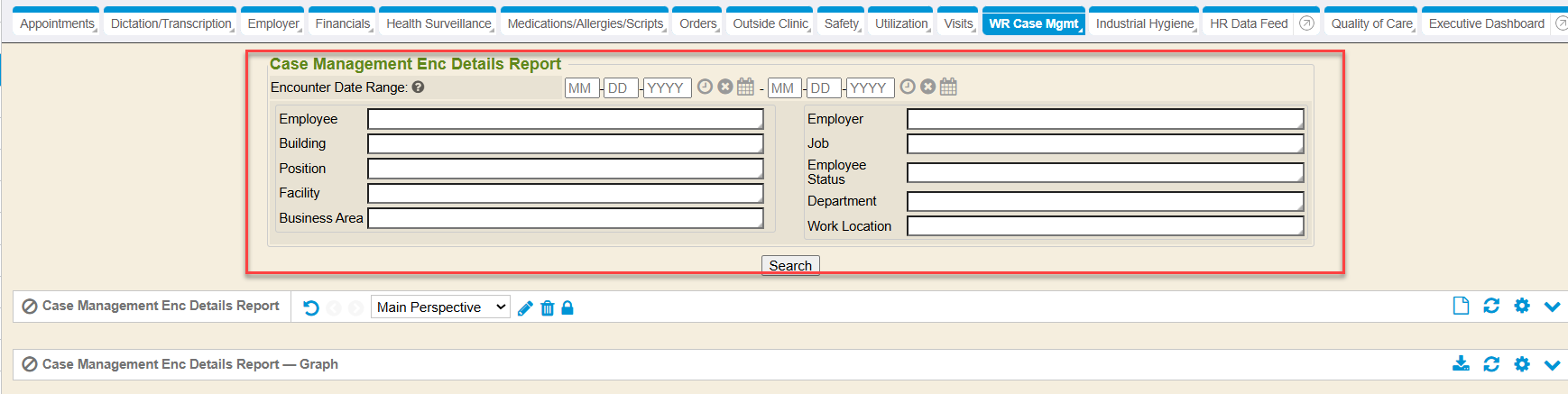 By default, the report will open up to be blank. It is recommended that you key in at least a date range before rendering the report. There are other search filter criteria data fields available to help narrow down your report results. However, you can get report results for the lifetime of the system by simply clicking on the first title section *Case Management Enc Details Report* below the search filter criteria area.