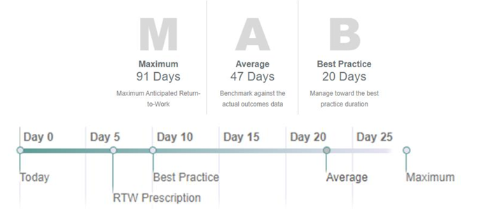 * Maximum Duration in Days: is the evidence-based upper limit for the expected length of disability or treatment for a specific medical condition or procedure based on the data elements sent in the query.
