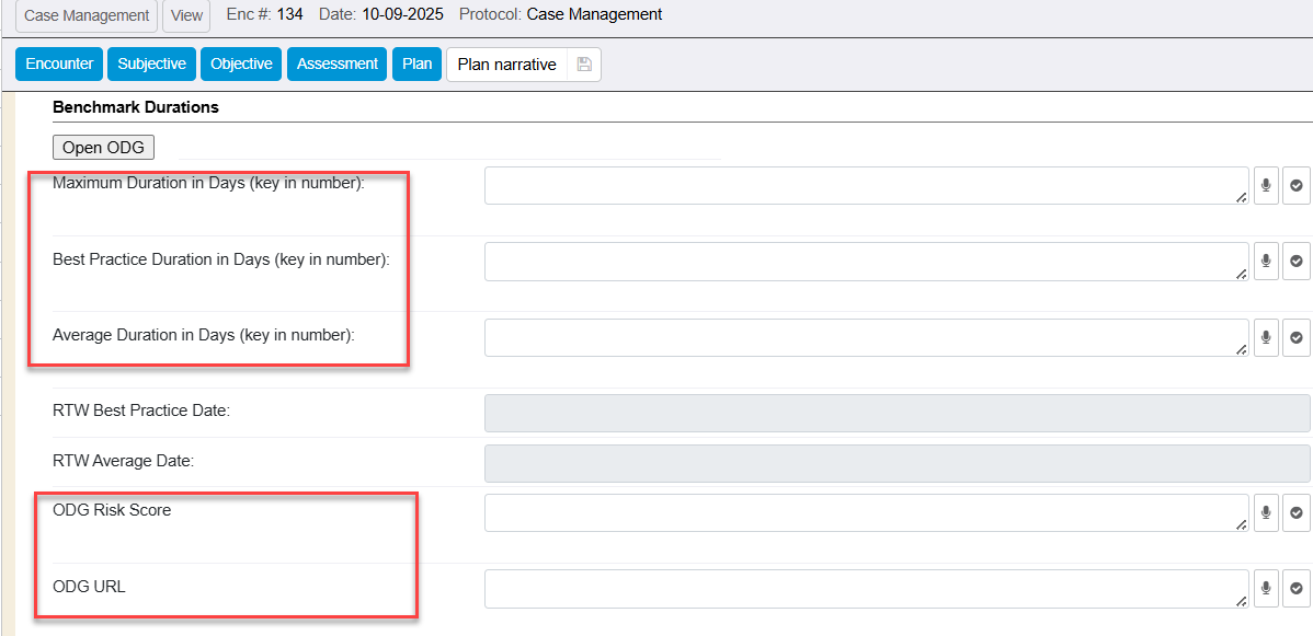Then you can easily toggle between ODG's system and your Enterprise Health encounter to manually key in the days for benchmark durations, as well as capture the risk score and url manually.