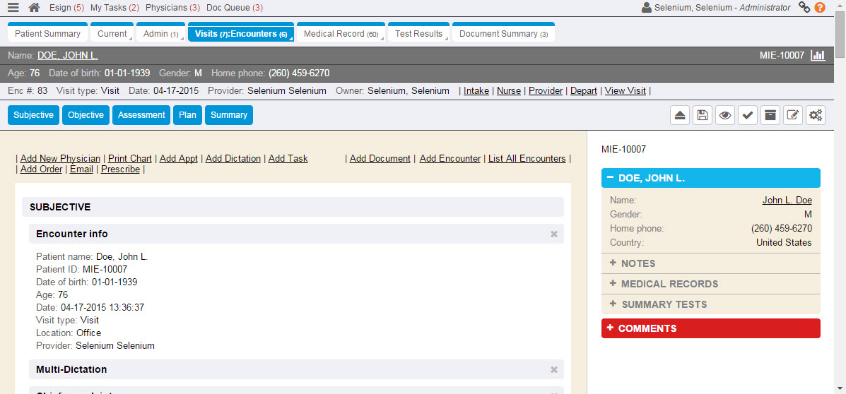 - The Encounter toolbar displays information and links to the open patient encounter.