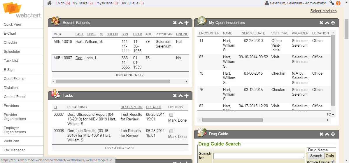 Searching for a patient’s chart still begins at the E-Chart tab. The overall look and feel of the patient search matches the new Enterprise Health styling, including the tabs. The E-Chart defaults to the Patient Summary page. The Patient Summary displays data in portlets much like the Quick View.